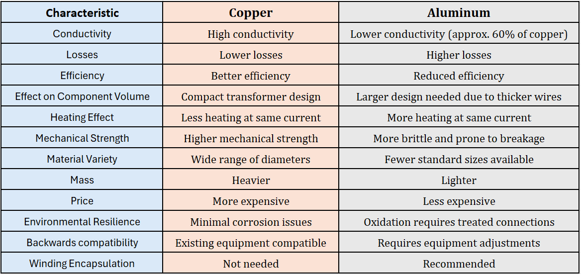 Aluminium, however, has its advantages. Weighing about one-third as much as copper, it is well-suited to applications where reduced weight is a priority, this makes it especially attractive in mobile or transport systems, or in installations where lifting or structural loads are a concern. To match copper’s electrical performance, aluminium windings require a greater cross-sectional area – approximately 1.6 times larger – resulting in increased winding volume and often larger overall component dimensions.